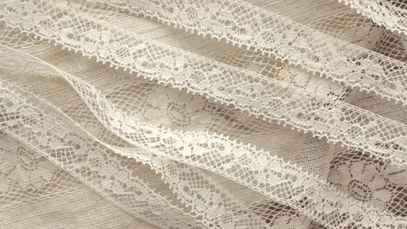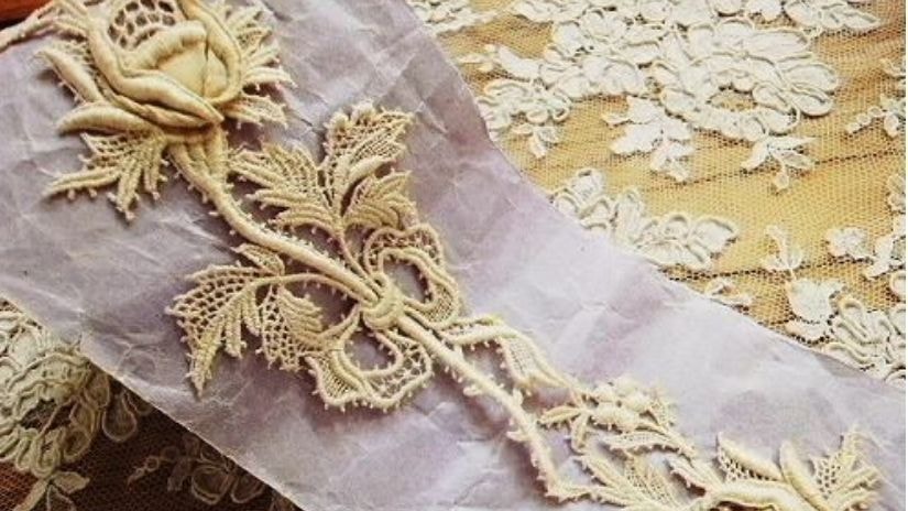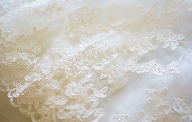 水に溶ける基布に綿糸などで連続模様を刺繍した後、基布を溶かし、刺繍糸だけを残したレース。重厚で豪華な見た目から、ドレスやフォーマルウエアに採用されることが多いですね。モチーフを切り離し、パーツにも用いられます。