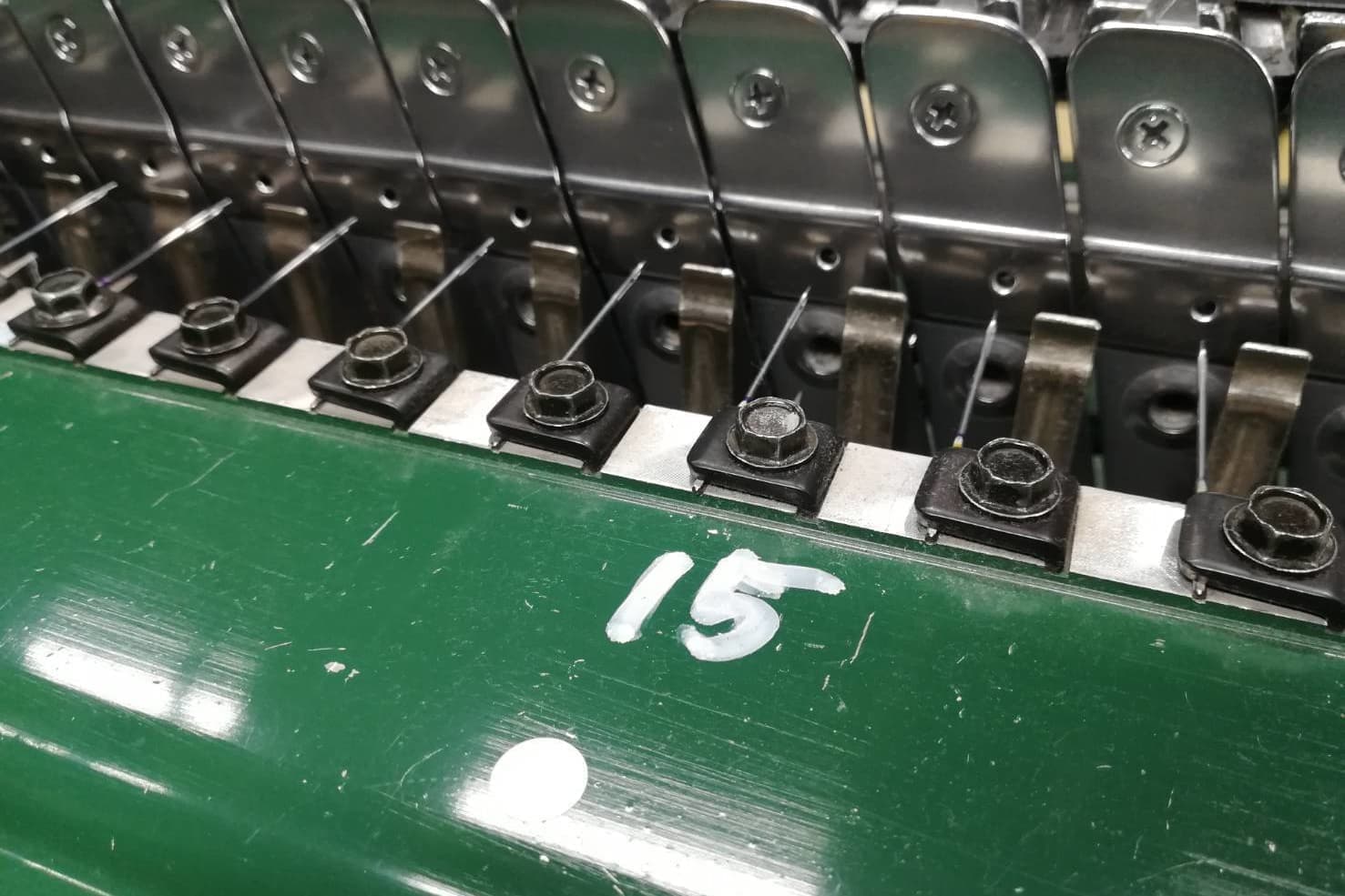 全長14m、高さ4.5mの巨大なレース機には上段520本、下段520本で合計1,040本ものレース針が設置されています。家庭用のミシンの針は通常上下に動いて布が縫えますが、レース機の針は、設置した布に針は前後に動き、布は上下左右に動きレース模様を描きだします。