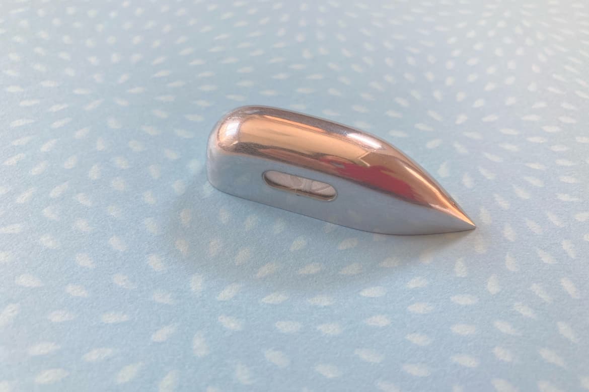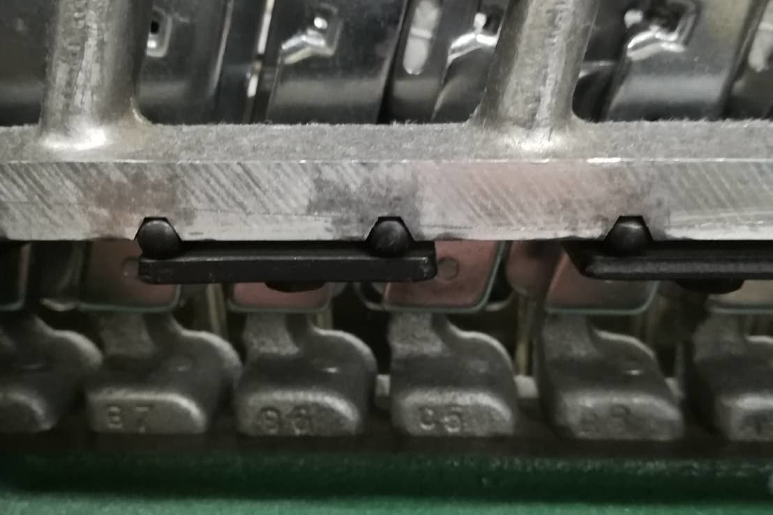 家庭用ミシンのボビンに当たる所をレース機ではシャトルと言います。シャトルと言ってもスペースシャトルの様に宇宙に飛立つことはありません。シャトルを格納するシャトルボックスに斜め右向きにセットされています。真ん中に穴が空いてるのは裏糸の残量が見えるためです。シャトルは少し斜め上下に稼働し表糸が布を通過する際に出来るループにシャトルの先端を潜らせ糸が縫われていくのです。
