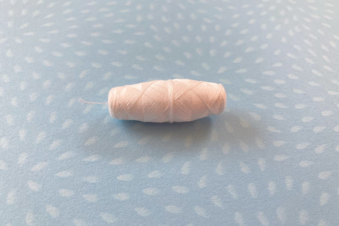 シャトルの中に手作業で裏糸を詰め1040個のシャトルを指先の感覚だけでテンション(糸調整)が均一になる様に調整します。緩かったり、固かったりしていまうとレース模様が崩れてしまいます。この1.5cmほどの蚕玉で約20時間ほど作業ができます。