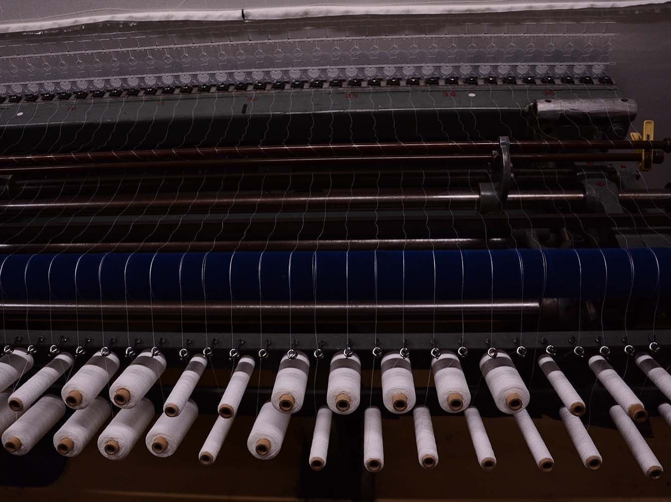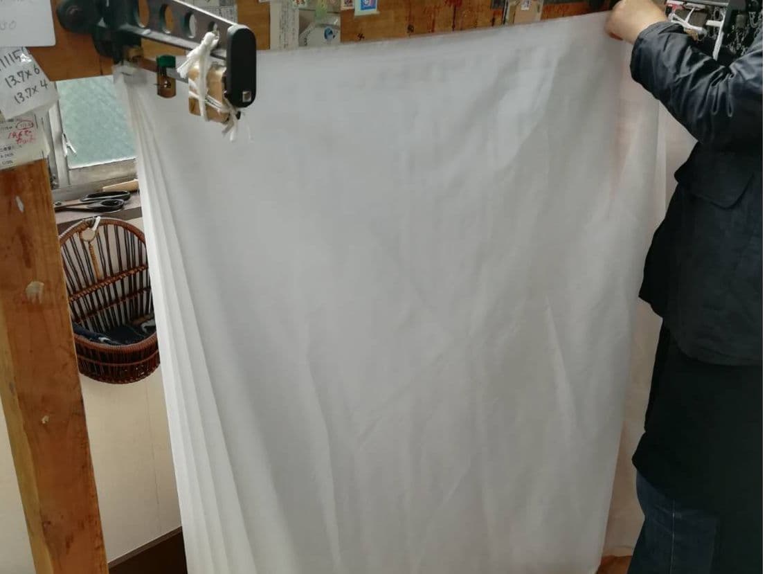 織機にかけるため、原反(げんたん:元の長い無地布)を14.7mに切り、必要部分を縫っていきます。