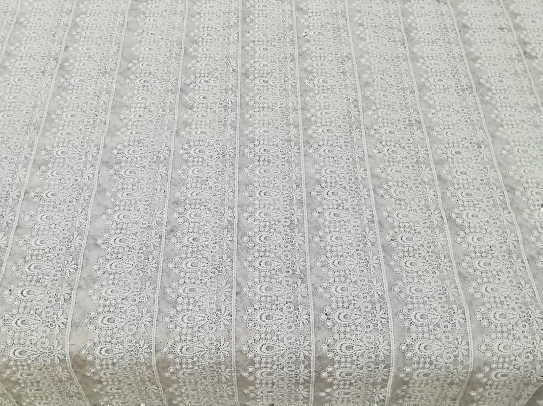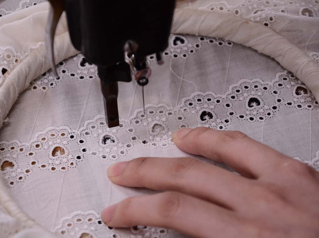仕上がった製図を元にレース柄を表現するために、手作業で行うことで針間隔をわずかに詰めたり広めるなど、微妙な加減で風合いを表現する職人の技量が問われる作業です。