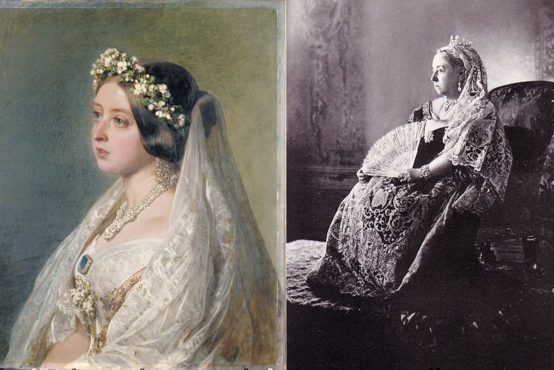 左は1840年、ホニトンレースのウエディングドレスを着用したヴィクトリア女王の肖像画です。36人のレース職人さんが一年半かけて作り上げた逸品で、右の写真のように、女王は即位60周年にもこの美しいレースとヴェールを身に纏いました。それまでカラードレスが主流だった花嫁衣装に白を用いる伝統が生まれたのは、ヴィクトリア女王のウエディングドレスがきっかけと言われています。
